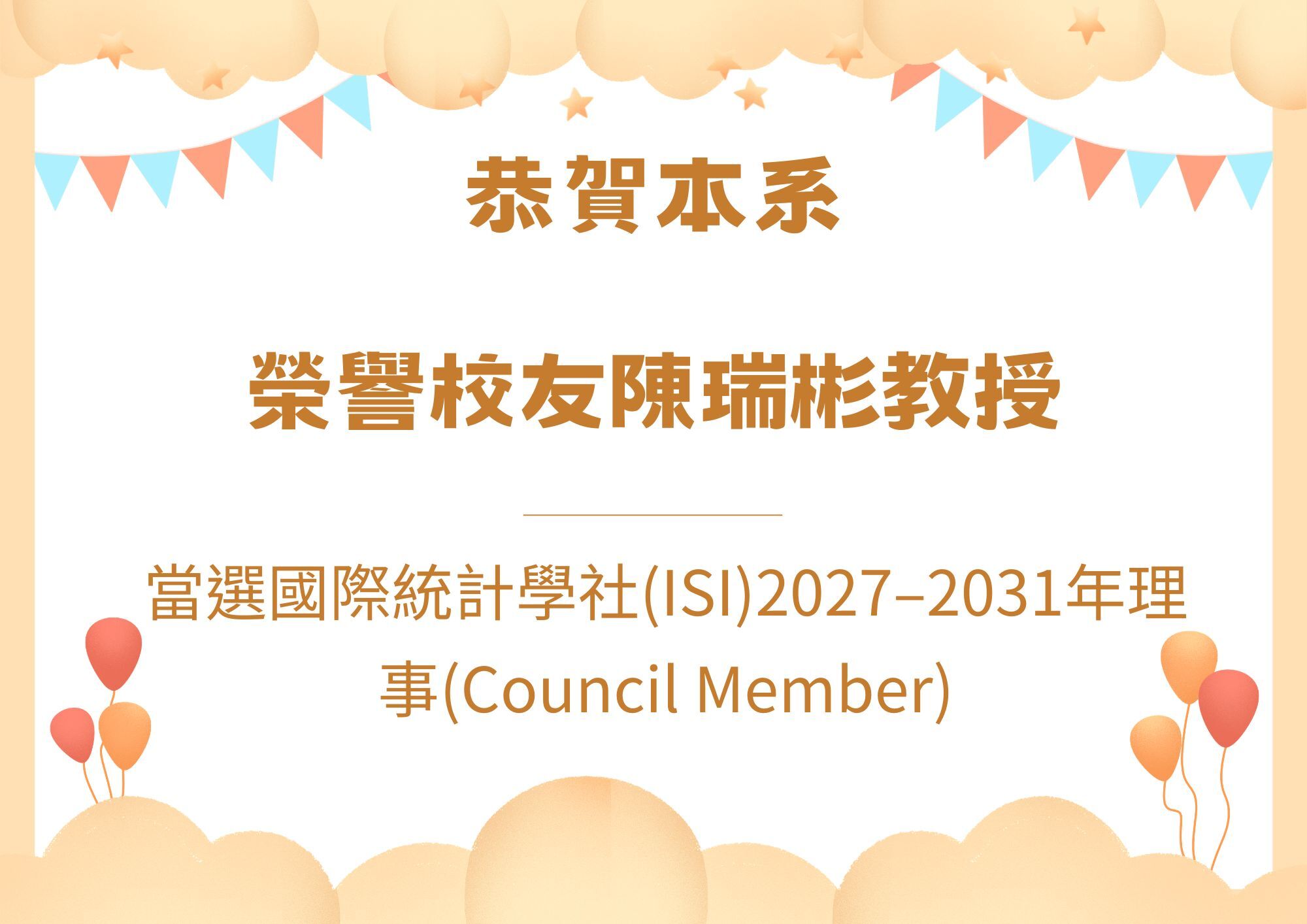 恭賀本系榮譽校友陳瑞彬教授當選國際統計學社(ISI)2027–2031年理事